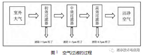 利用初效过滤器、中效过滤器及高效过滤器对空气的滤过作用,依次逐级地滤除空气当中的各种粒径的尘埃粒子,从而控制送入室内的空气的洁净度。