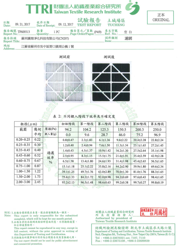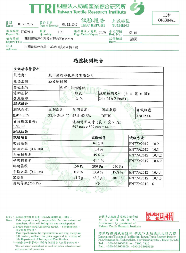 最后附上我司初效过滤器第三方检测报告的部分内容(欧标EN779-2012),供大家研习参考之用。见下图